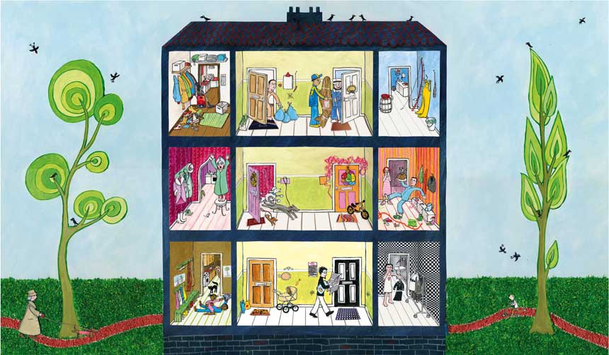 -opisuję gdzie stoją, wiszą, leżą oraz znajdują się poszczególne meble i sprzęty